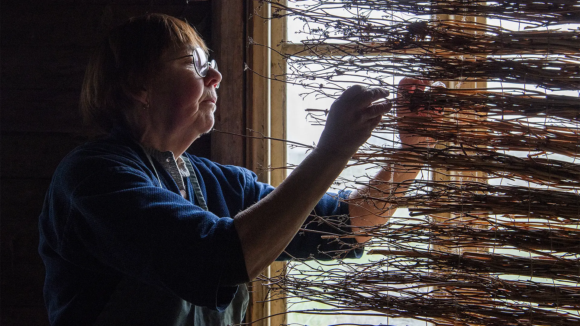 Vårljuset silas genom väven av bovetestjälkar som Gunnel torkat.