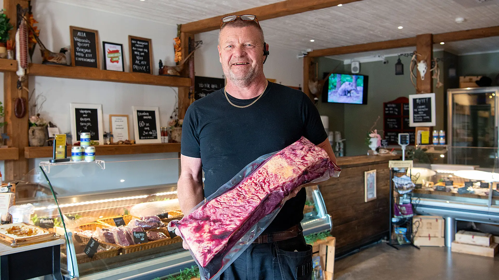 I butiken på Kravgodkända vildsvinsfarmen i Sjunkaröd hittar vi lufttorkat vildsvin, viltleverpastej på hjort och vildsvin, samt filé, färs och andra styckningsdetaljer från lamm, fasan, vildsvin, nöt och hjort.
