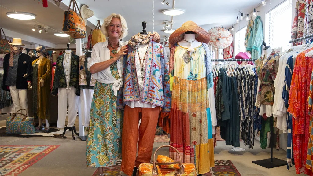 I Anette Odelbergs färgstarka butik får gamla och nya sidentyger nytt liv i hennes kaftaner, klänningar och rökrockar. Hon jobbar nära sina skräddare i Indien och vurmar för hållbara naturmaterial.